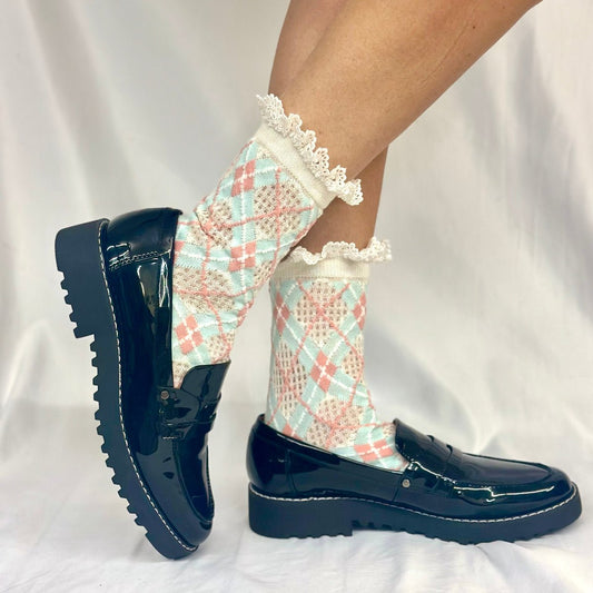 ARGYLE pastel preppy lace top sock