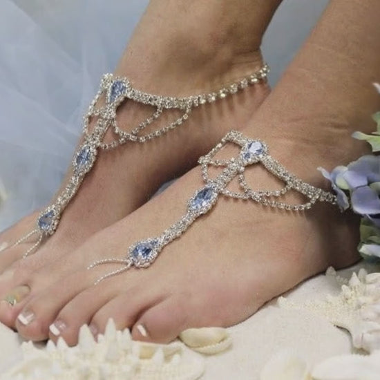 BRIDE Blue Silver Barefoot Sandals - Handcrafted Rhinestone Beach Wedding Foot Jewelry